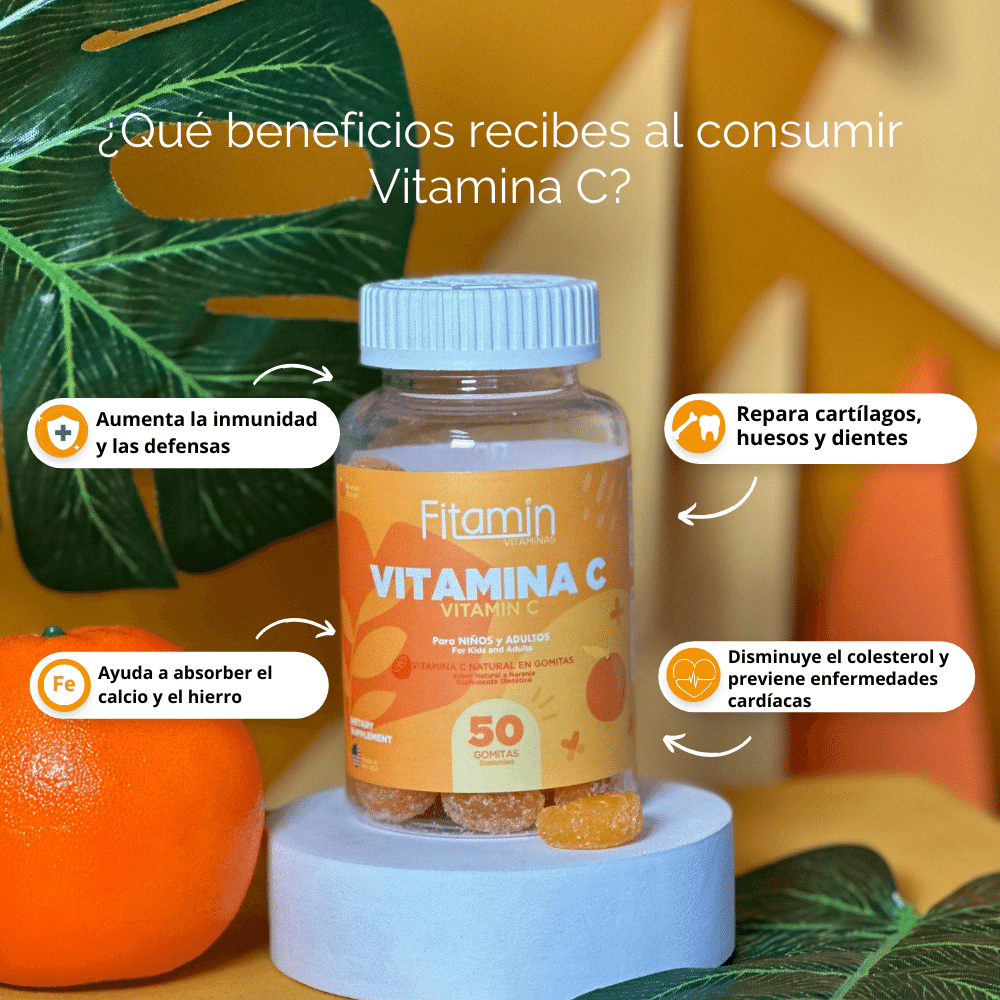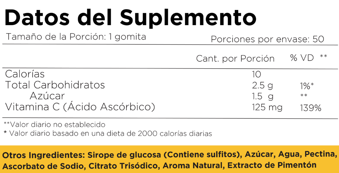 Cada gomita contiene 60 mg de vitamina C, la cantidad diaria recomendada para adultos y niños a partir de los 3 años de edad. La vitamina C es un nutriente esencial que ayuda a: